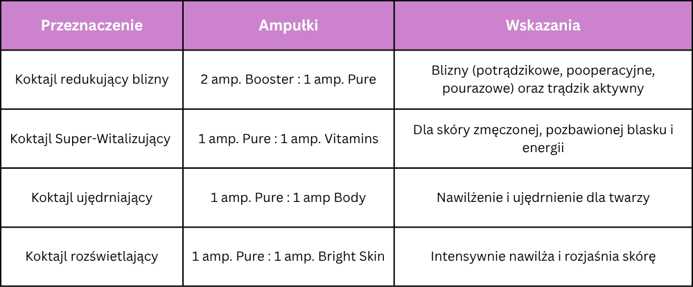 Wielokrotnie nagradzane ampułki Revitalize przynoszą spektakularne efekty nawet przy samodzielnym stosowaniu. Aby jednak w pełni dopasować ich działanie do indywidualnych potrzeb skóry Twojego pacjenta, możesz łączyć je w spersonalizowane koktajle z serum. Poniżej przedstawiamy przykładowe koktajle z użyciem Revitalize Pure, prosto od producenta:
