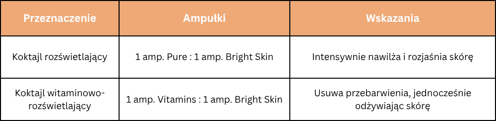 Ampułki Revitalize, wielokrotnie nagradzane za skuteczność, dają znakomite efekty już przy samodzielnym stosowaniu. Aby jeszcze lepiej dopasować działanie preparatu do potrzeb skóry pacjenta, można tworzyć spersonalizowane koktajle łącząc Revitalize Bright Skin z innymi serum. Poniżej prezentujemy przykładowe propozycje koktajli rekomendowane przez producenta.